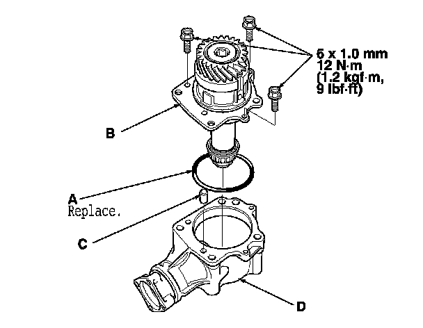 48. Coat a new O-ring (A) with MTF, install it on the transfer holder assembly (B), then install the dowel pin (C) and the transfer holder assembly in the transfer housing (D).