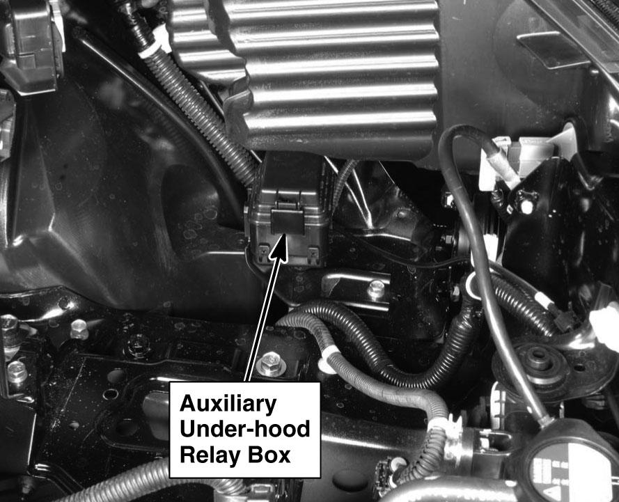 Auxiliary Under-Hood Relay Box Left side of engine compartment. See Figure.