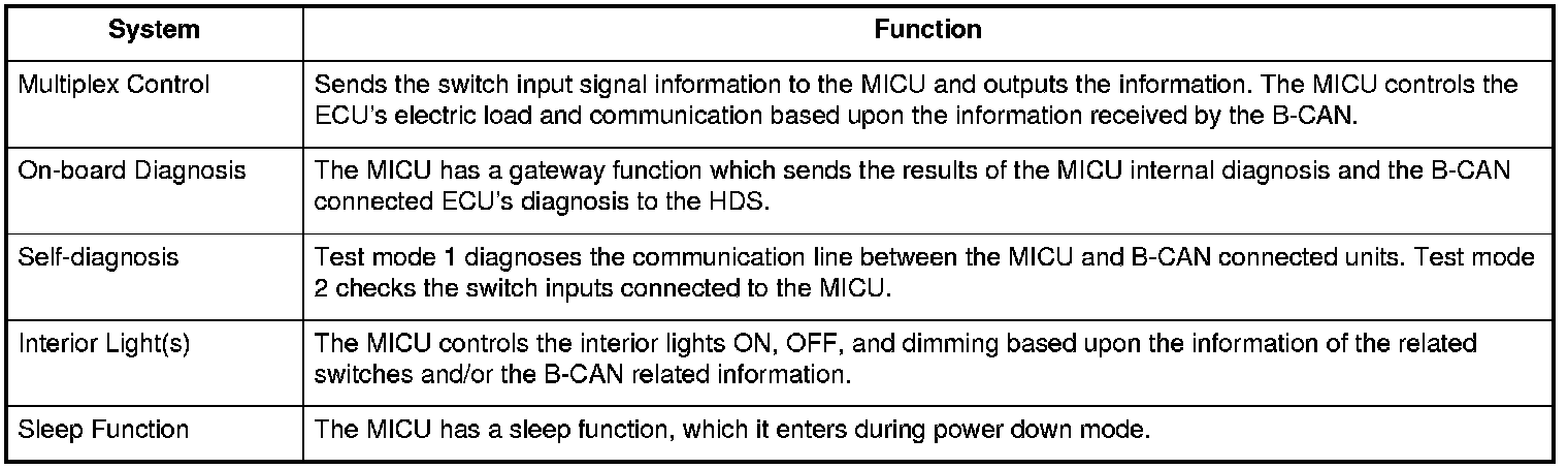 The MICU (built into the under-dash fuse/relay box) is one of the B-CAN components. The MICU controls many systems related to the body controller area and the security system, and it also works as a gateway to diagnose the other B-CAN connected ECUs with the HDS.