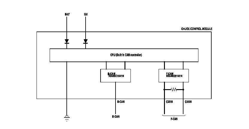 The body controller area network (B-CAN) and the fast controller area network (F-CAN) share information between multiple electronic control units (ECUs). B-CAN communication moves at a slower speed (33.33 kbps) for convenience related items and for other functions. F-CAN information moves at a faster speed (500 kbps) for "real time" functions such as fuel and emissions data. To allow both systems to share information, the gauge control module translates information from B-CAN to F-CAN and from F-CAN to B-CAN.