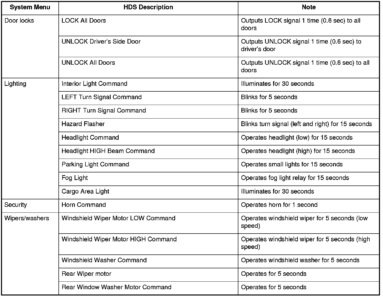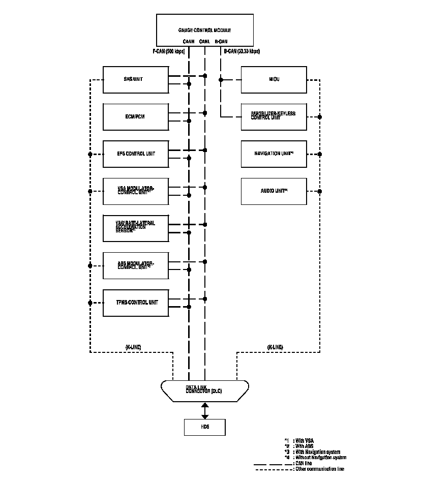 By connecting the HDS to the data link connector (DLC), the HDS can retrieve the diagnostic information from the MICU via a diagnostic line called K-LINE. The K-LINE is separated from the CAN lines, but it is connected to the CAN related ECUs. The MICU is a gateway between the HDS and B-CAN related ECUs, and it sends B-CAN diagnostic information to the HDS. When doing a function test with the HDS, the HDS sends an output signal through the K-LINE to the MICU. The MICU either relays the request to another ECU or commands the function itself.