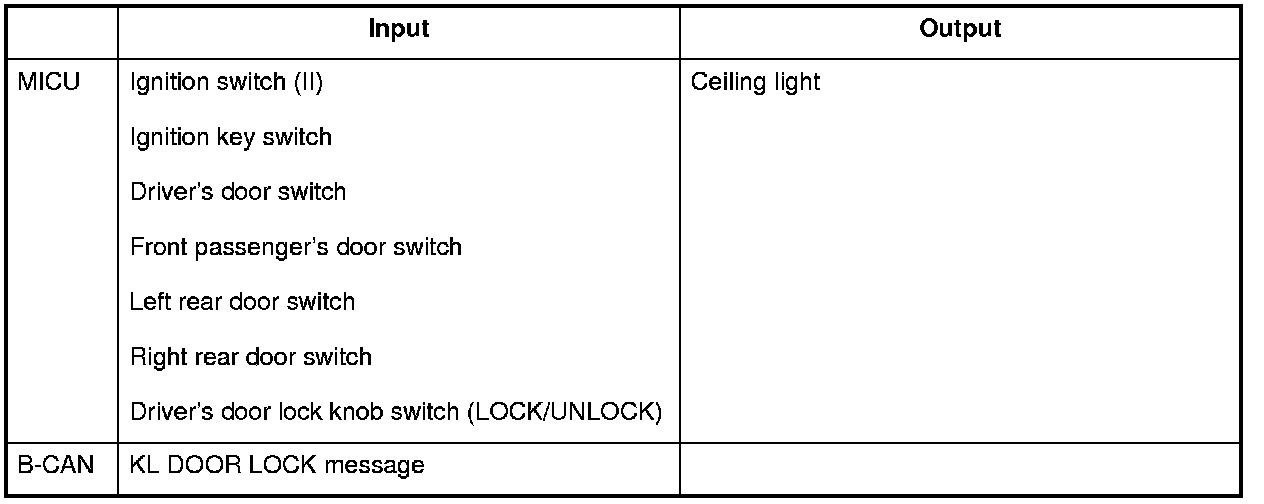 The MICU control of the interior lights is based on input signals of each switches and the keyless signals sent by the B-CAN.