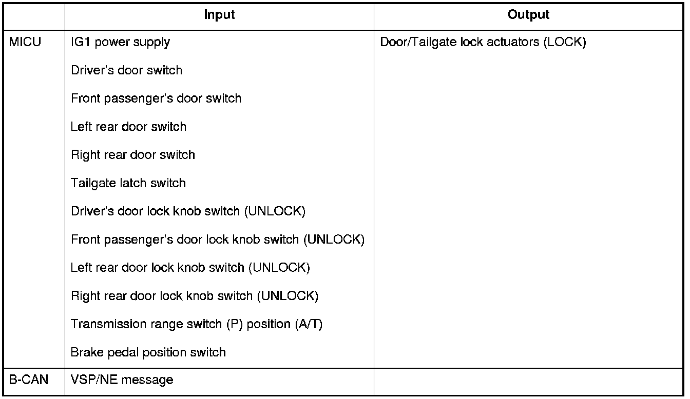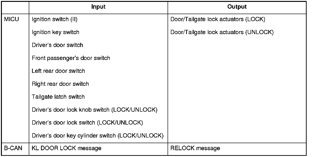 The MICU control of the door lock actuators is based on input signals of each switch and B-CAN signals.
