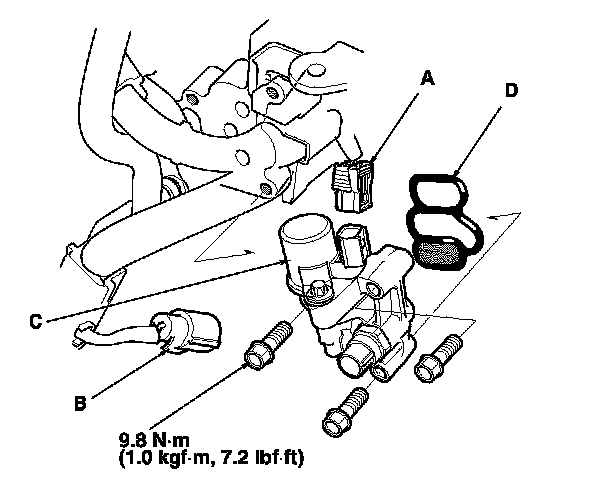 3. Remove the rocker arm oil control valve assembly (C) and the rocker arm oil control valve filter (D).