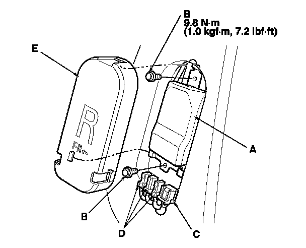 1. Place the ODS unit (A) on the seat-back frame. Install the two bolts (B).