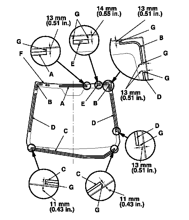 11. Attach rubber dams A, B, C, and D and the upper clips (E) with adhesive tape to the inside face of the windshield (F) as shown:
