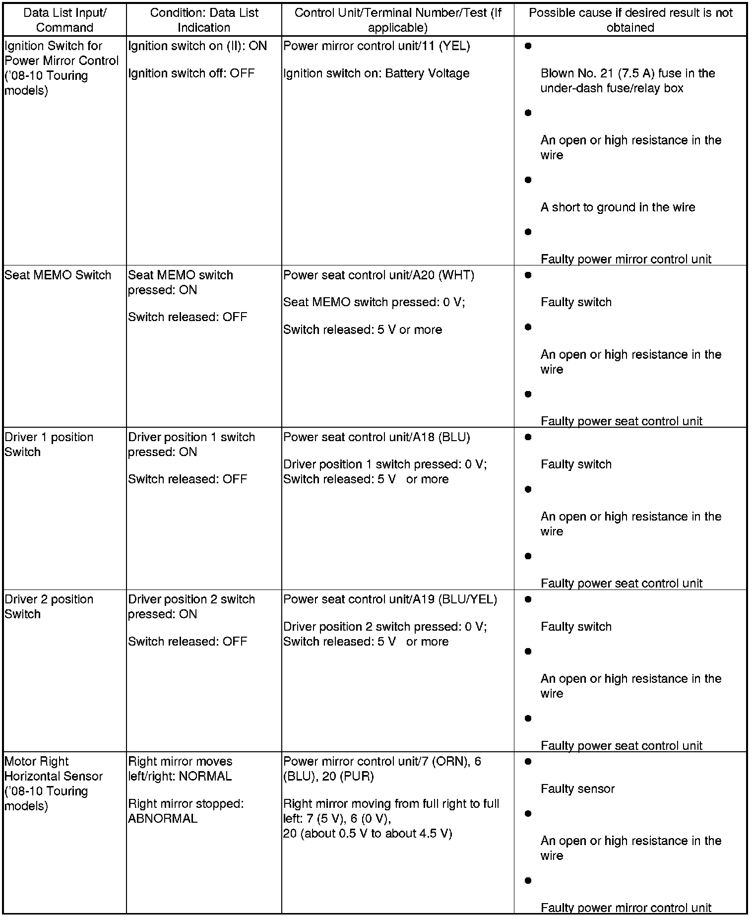 - If the function does not operate normally, perform the appropriate test at the control unit and terminal indicated in the table.