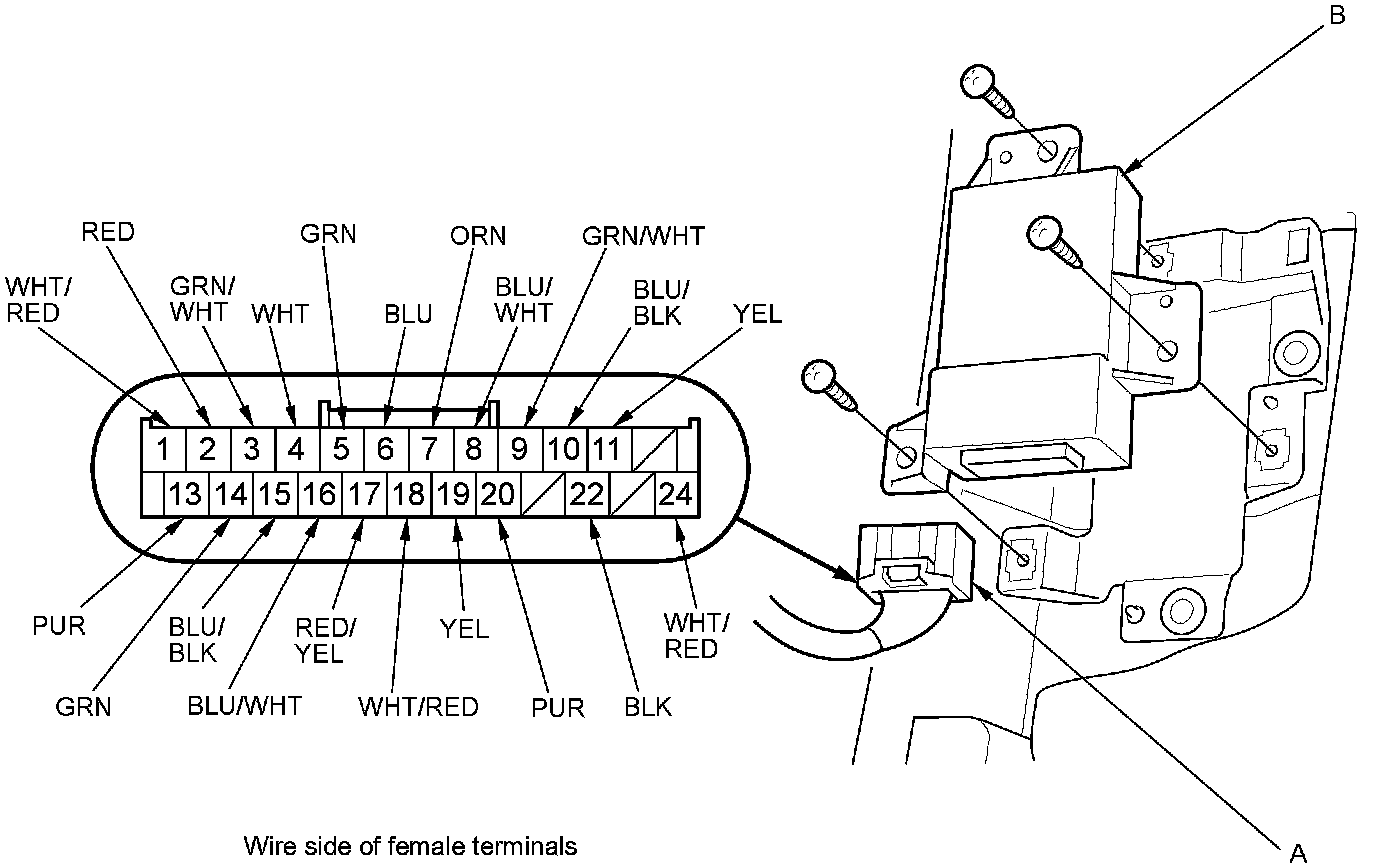 3. Disconnect the 24P connector (A) from the power mirror control unit (B).