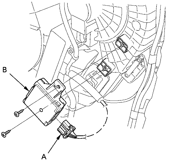 2. Disconnect the connector (A) from the rear climate control unit (B), then remove the self-tapping screws and the rear climate control unit.