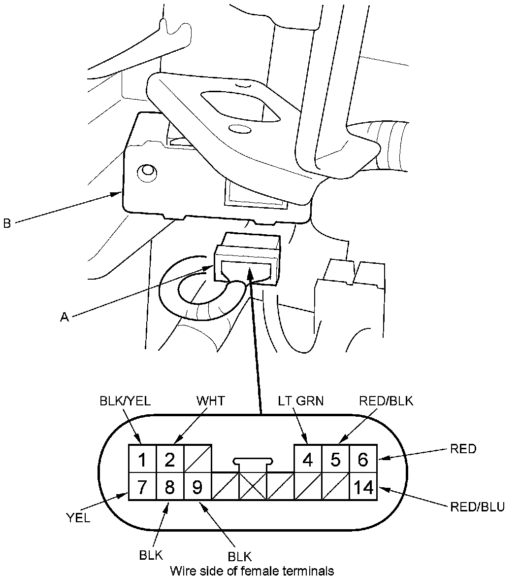 3. Disconnect the 14P connector (A) from the automatic lighting control unit (B).