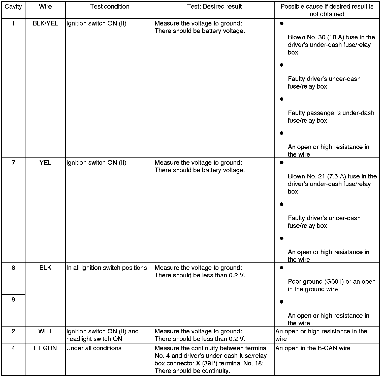 5. Reconnect the automatic lighting control unit connector, then do these input tests at the following connectors.