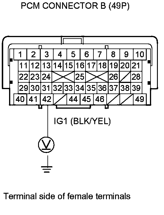56. Measure the voltage between PCM connector terminal B42 and body ground.