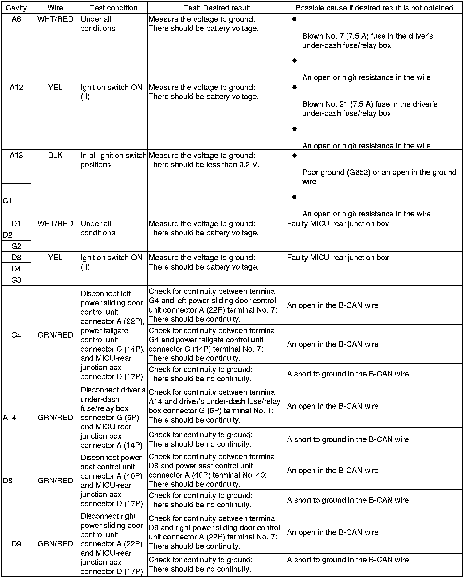 4. Reconnect the connectors to the MICU-rear junction box and do these input tests at the following connectors on the MICU-rear junction box.