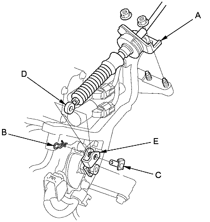 18. Apply molybdenum grease to the hole in the bushing (A) in the shift cable end (B). Attach the shift cable end to the selector control lever (C), then insert the control pin (D) into the selector control lever hole through the shift cable end, and secure the control pin with the spring clip (E).