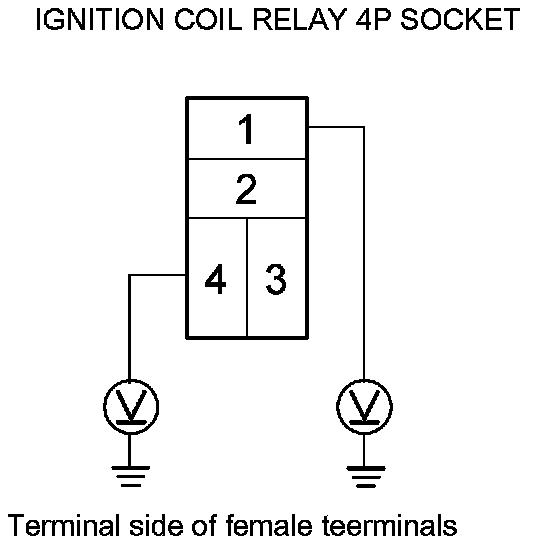 3. Measure the voltage between ignition coil relay 4P socket terminal No. 1 and body ground, then terminal No. 4 and body ground.