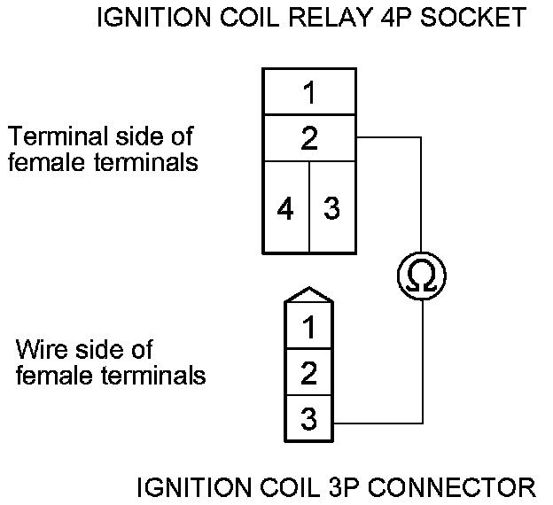 4. Check for continuity between each ignition coil relay 4P socket terminal No. 2 and ignition coil 3P connector terminal No. 3.