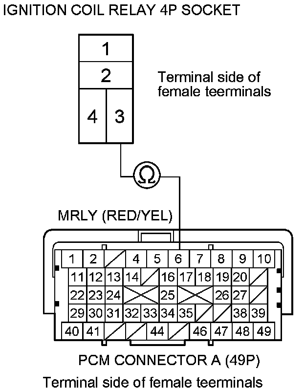 12. Check for continuity between ignition coil relay 4P socket terminal No. 3 and PCM connector terminal A6.