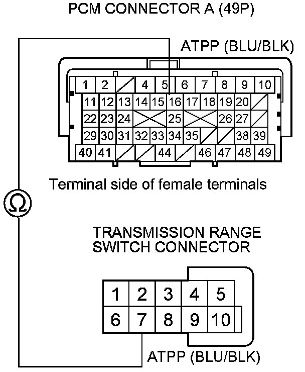 Repair open in the wire between PCM connector terminal A16 and the transmission range switch connector.�