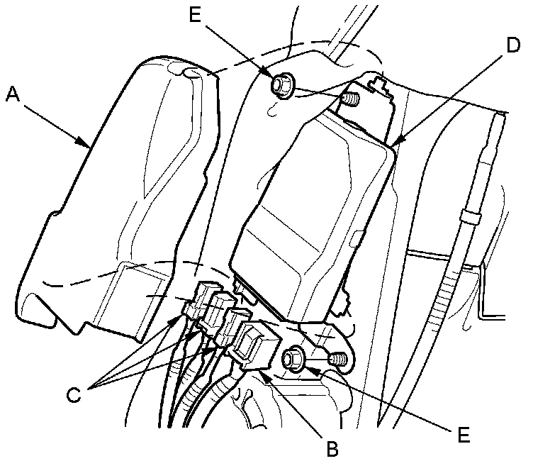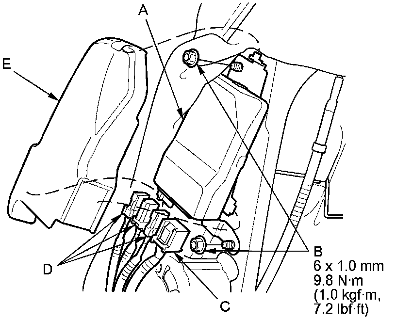 1. Place the ODS unit (A) on the seat-back frame. Install the two mounting nuts (B), and connect the ODS unit harness 18P connector (C) and OPDS sensor connectors (D) to the ODS unit. Reinstall the cover (E).