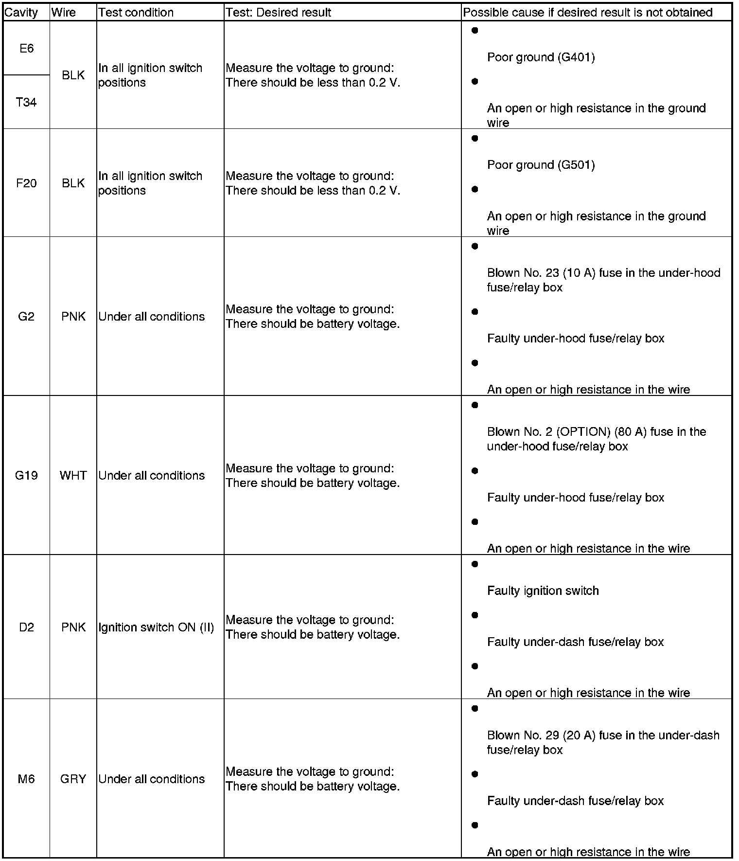 NOTE: Before testing, make sure the No. 10 (7.5 A) fuse in the under-dash fuse/relay box.