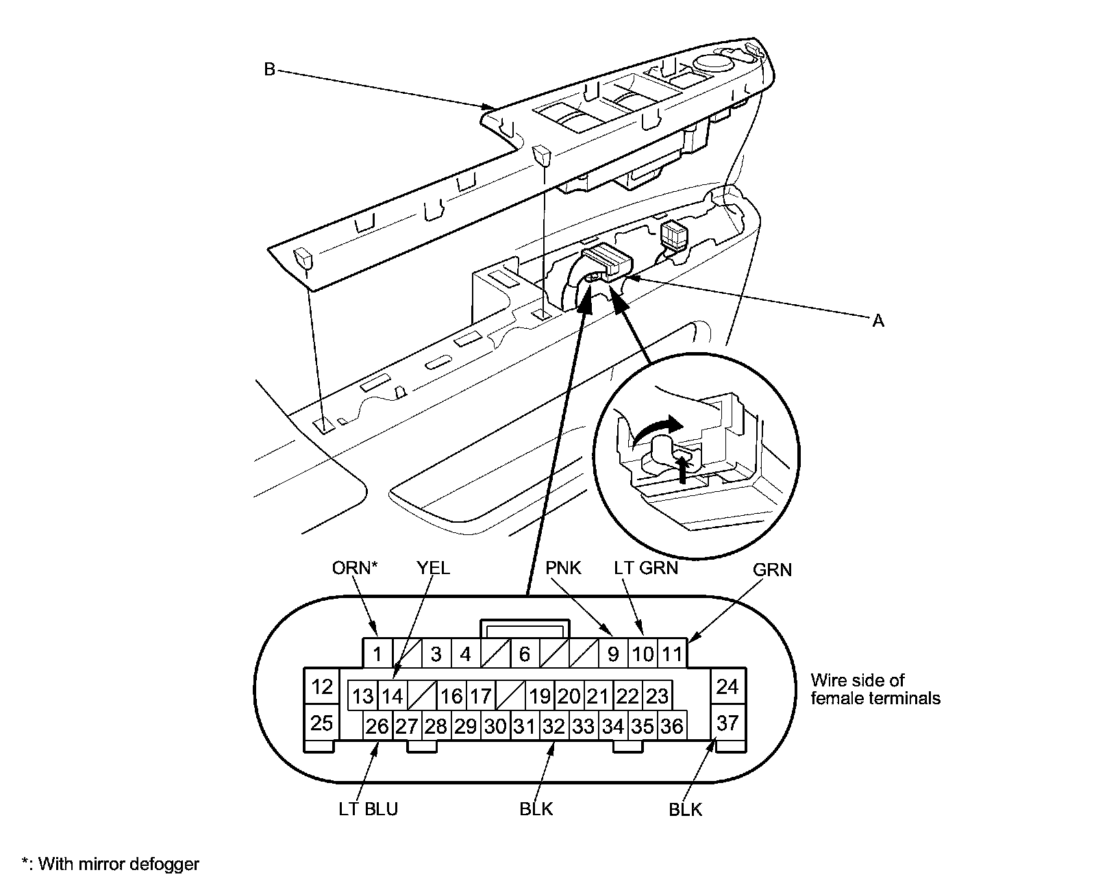 2. Disconnect the 37P connector (A) from the power window master switch (B).