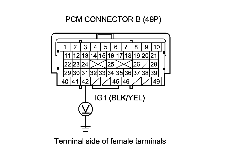 59. Measure the voltage between PCM connector terminal B42 and body ground.