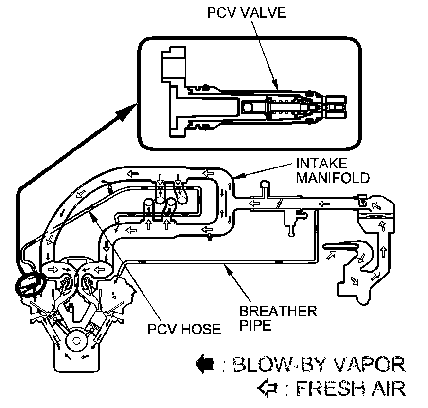 The PCV valve prevents blow-by gasses from escaping into the atmosphere by venting them into the intake manifold.