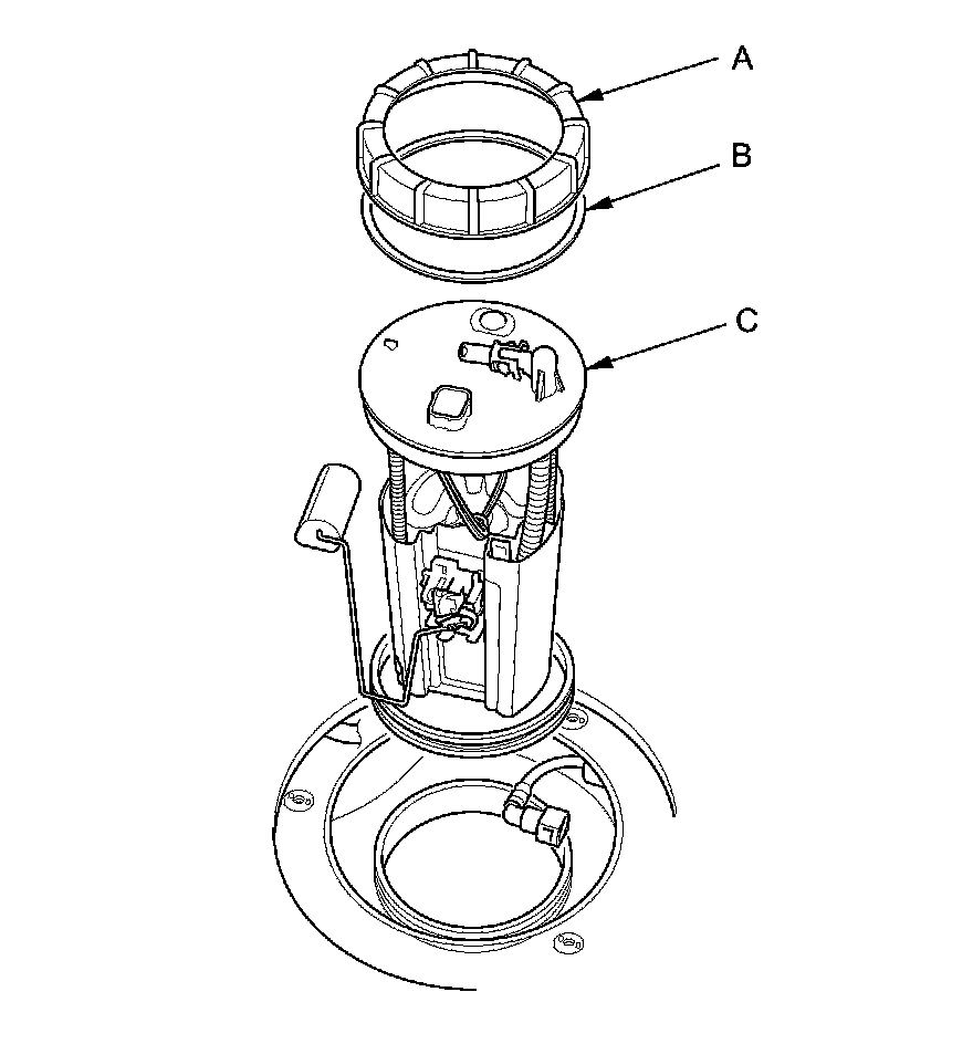8. Remove the locknut (A), the locknut plate (B), and the fuel tank unit (C).