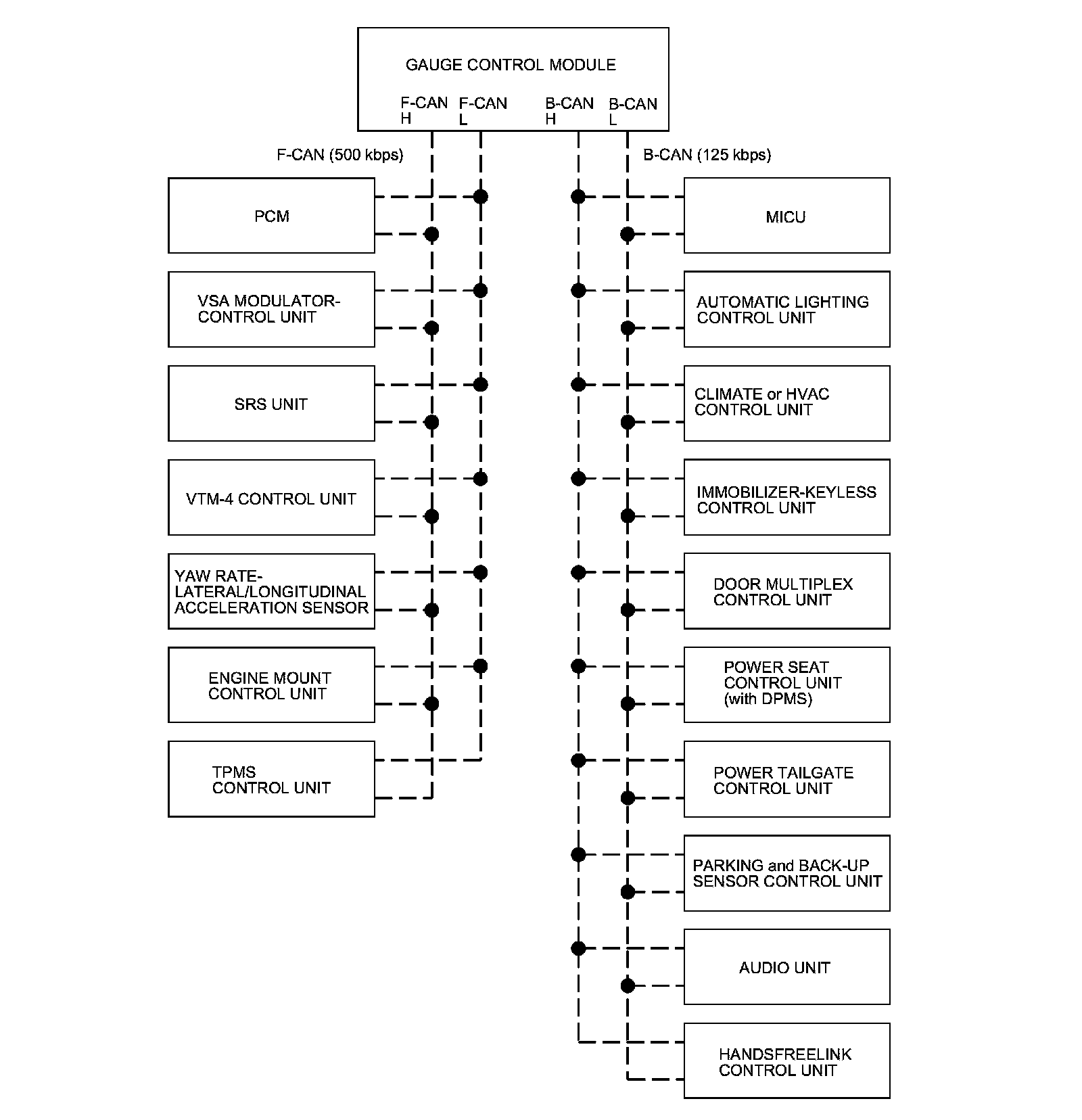 The gauge control module acts as a gateway to allow both systems to share information, the gauge control module translates and relays the information from B-CAN to F-CAN and from F-CAN to B-CAN.