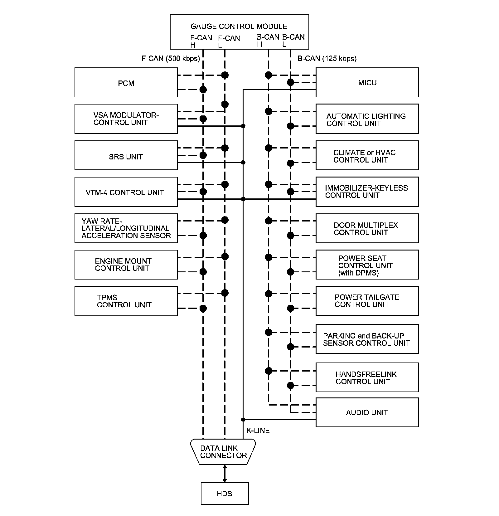 By connecting the HDS to the data link connector (DLC), the HDS can retrieve the diagnostic information from the MICU via a diagnostic line called the K-LINE. The K-LINE is separated communication line from the CAN lines, but it is connected to most of the CAN related ECUs. The MICU is a gateway between the HDS and B-CAN related ECUs, and sends B-CAN diagnostic information to the HDS. When doing a function test with the HDS, the HDS sends an output signal through the K-LINE to the MICU. The MICU either relays the request to another ECU, or commands the function.