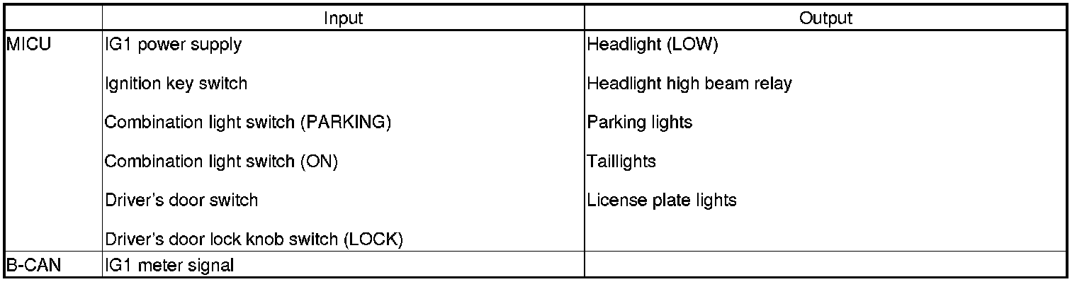 The MICU controls the headlight auto-off function based on inputs from each switch and B-CAN data.