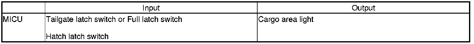 The MICU controls the cargo area light based on the hatch glass latch switch and the tailgate latch switch or the full latch switch inputs.