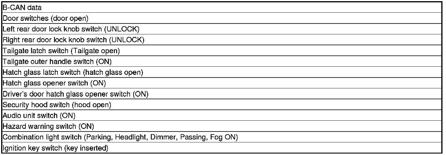 NOTE: If any control unit is faulty and will not wake up, several circuits in the system will malfunction at the same time. In the table, the control unit is followed by a list of the switches and input signals that can wake it up.