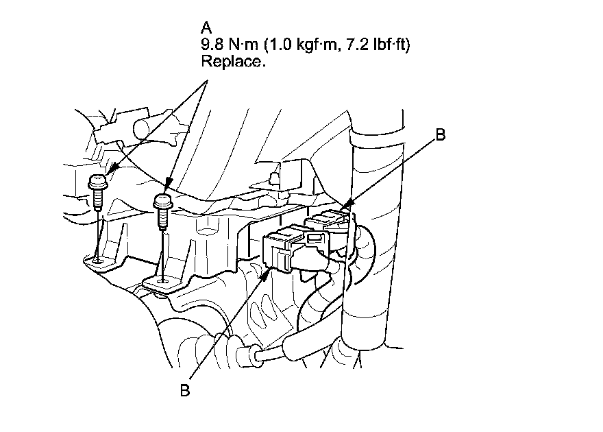 2. Install the new TORX bolts (A), using a TORX T30 bit, then connect the connectors (B) to the SRS unit; push them into position until they click.