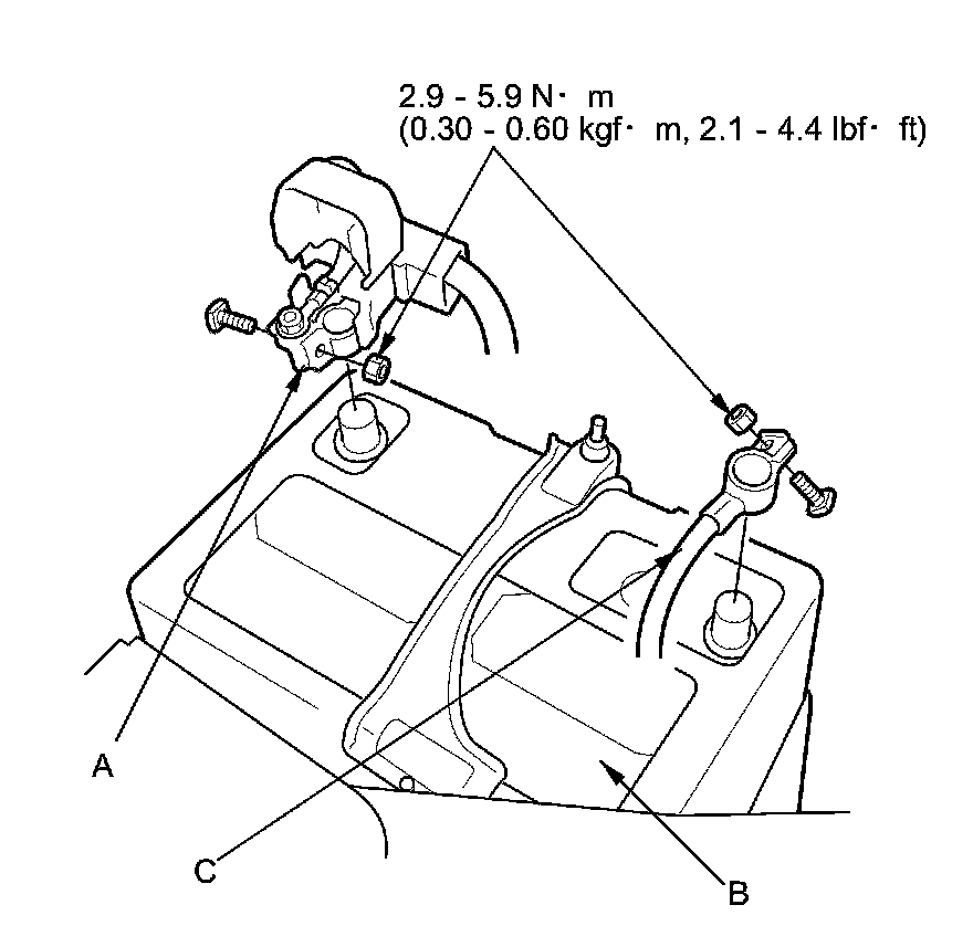 3. Reconnect the positive cable (A) to the battery (B) first, then reconnect the negative cable (C) to the battery.