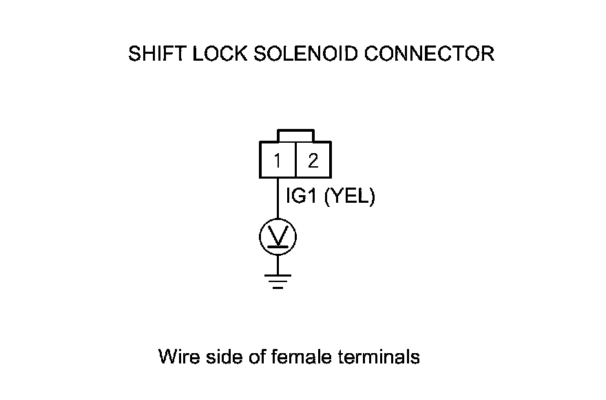 14. Release the brake pedal, and measure the voltage between shift lock solenoid connector terminals No. 1 and No. 2. The shift lever must be in P.