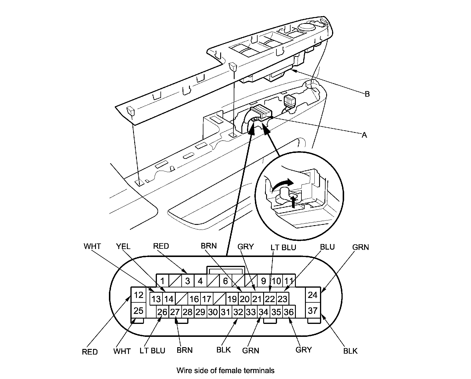 2. Disconnect the 37P connector (A) from the power window master switch (B).