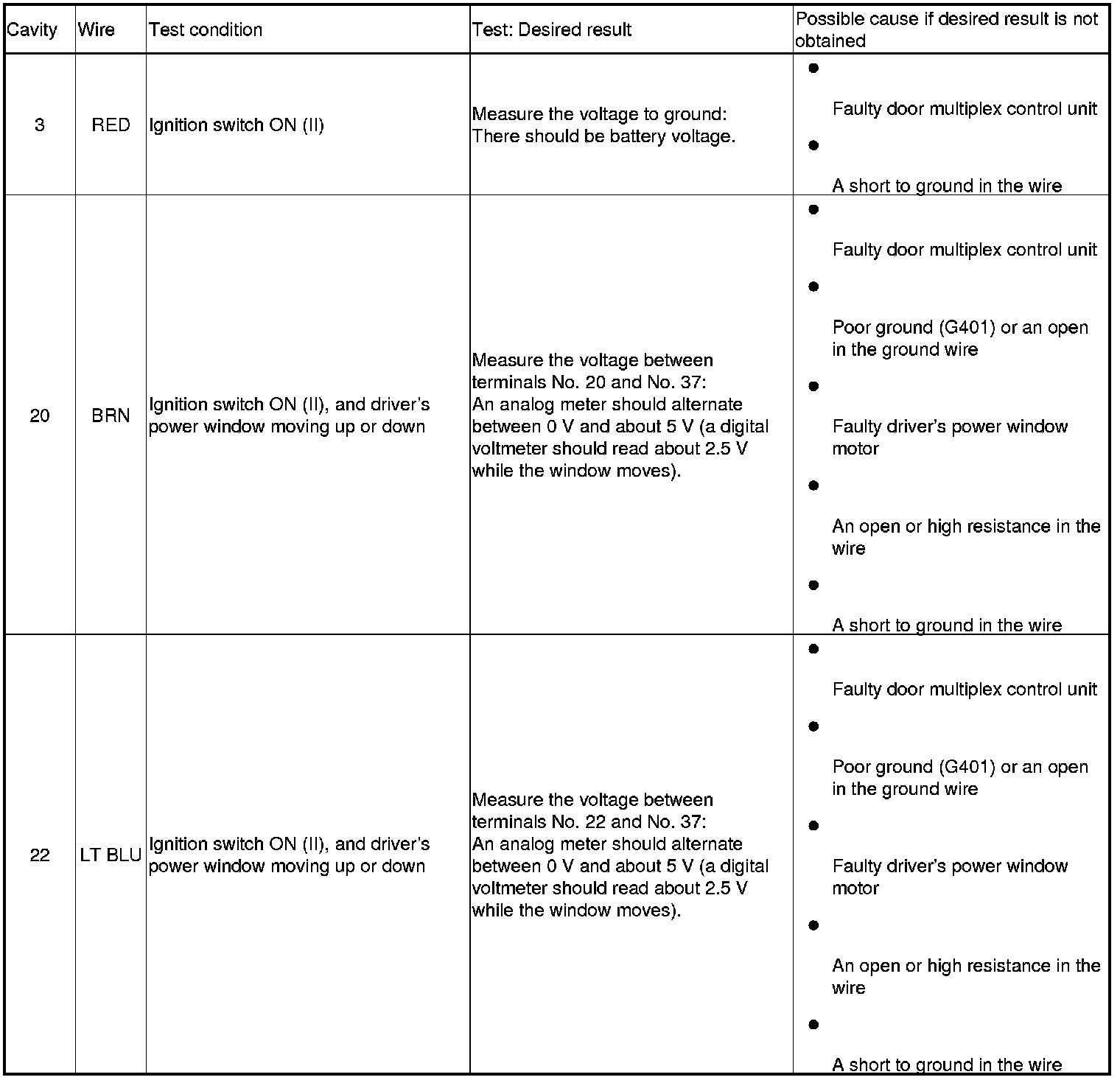 Home >> Honda >> 2009 >> Pilot 2WD V6-3.5L >> Repair and Diagnosis >> Windows and Glass >> Windows >> Testing and Inspection >> Component Tests and General Diagnostics >> Power Window Master Switch (Door Multiplex Control Unit) Input Test