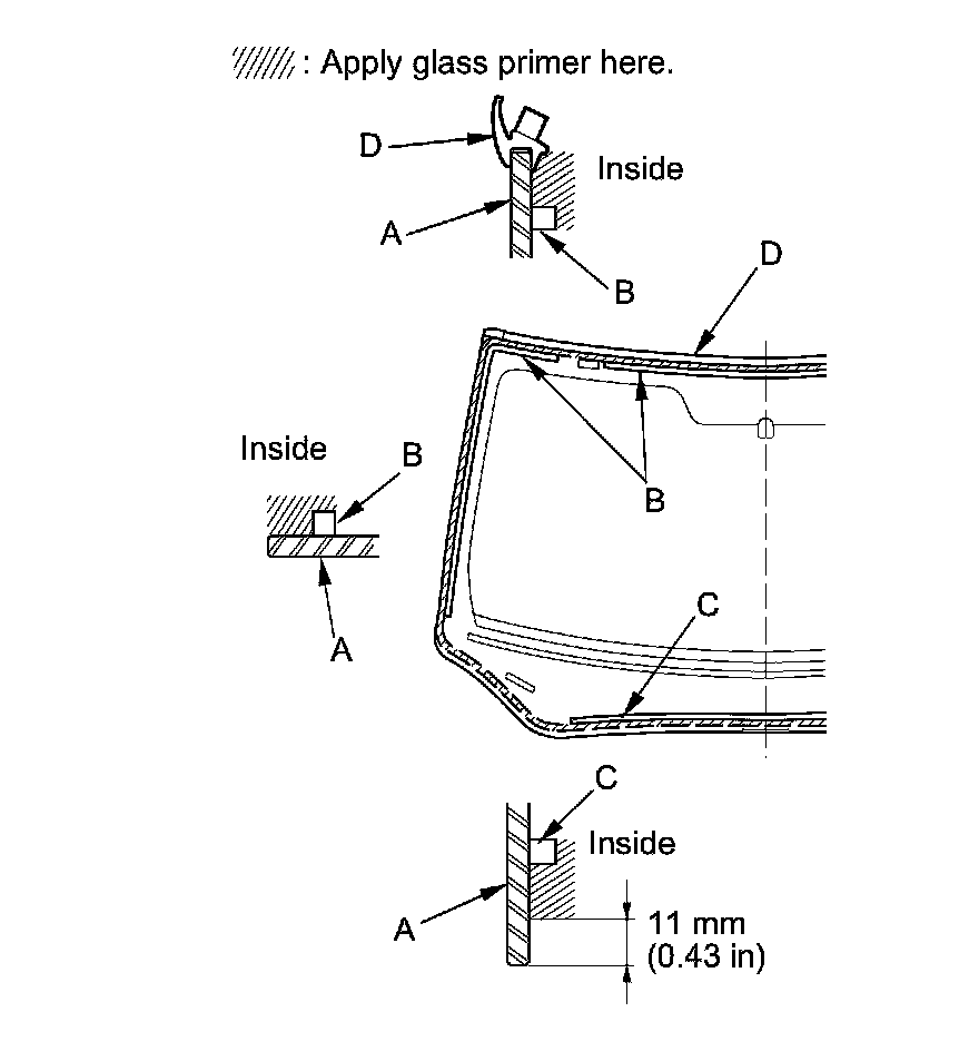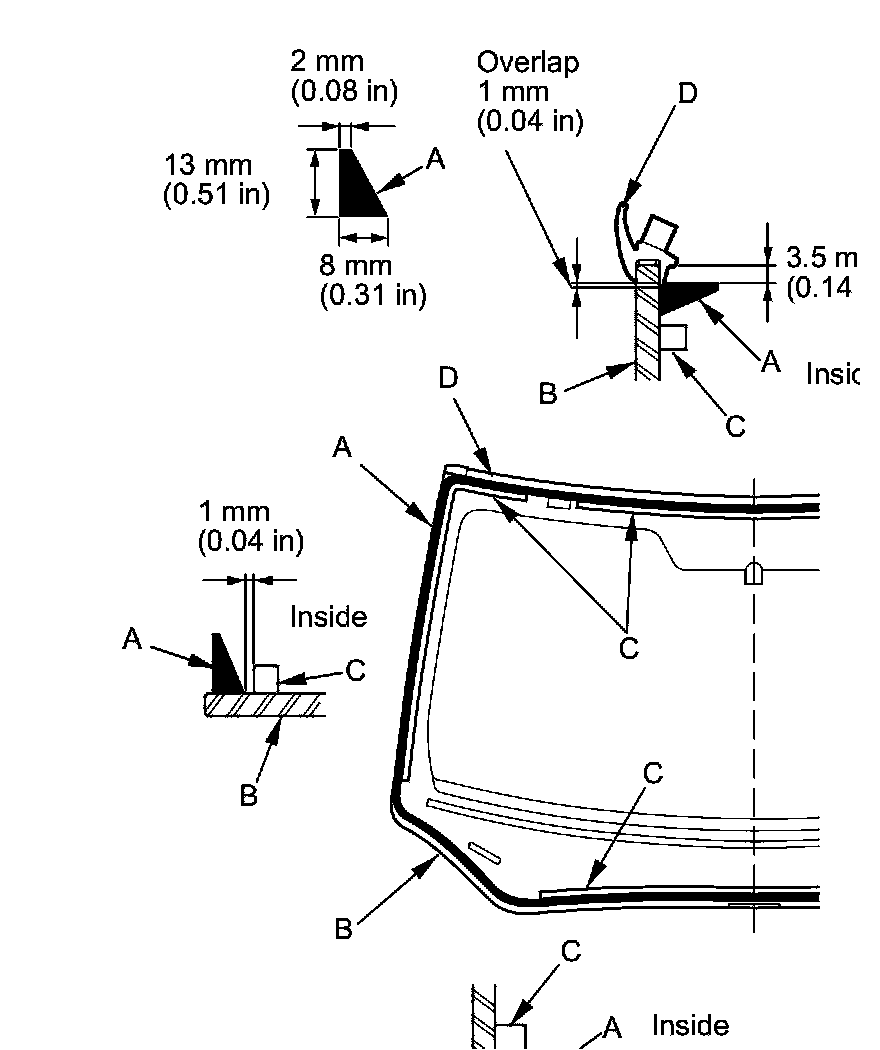 11. Attach the rubber dams A, B and the upper clips (C) with adhesive tape to the inside face of the windshield (D) as shown: