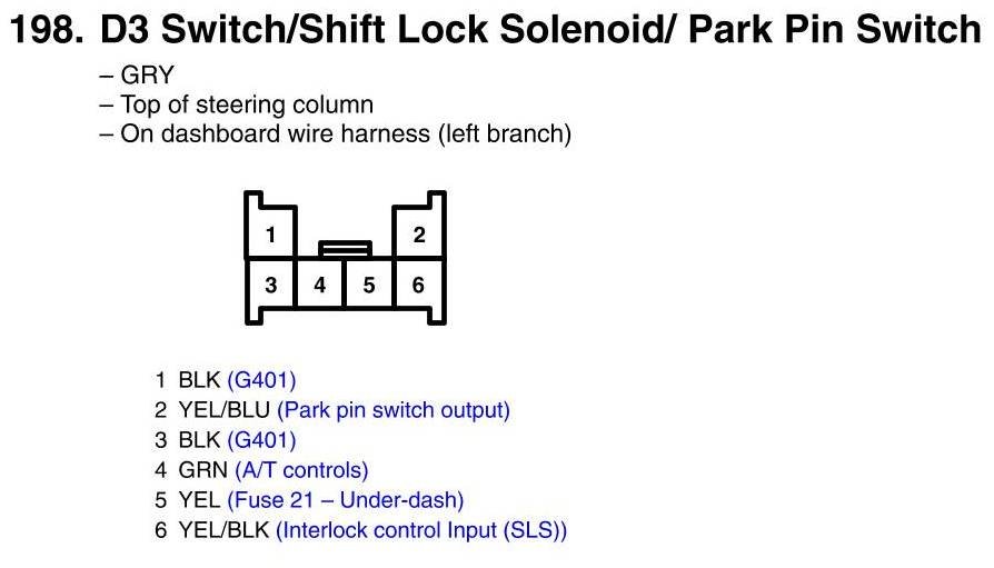 View 198 - D3 Switch/Shift Lock Solenoid/Park Pin Switch Connector View
