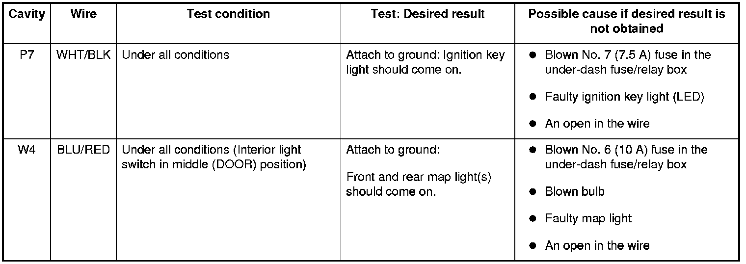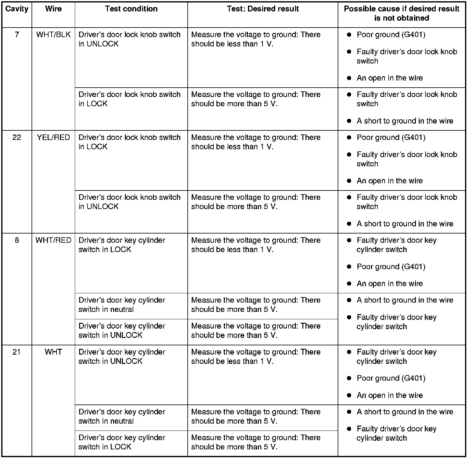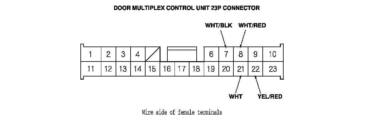 11. Reconnect the connector to the door multiplex control unit. Turn the ignition switch to ON (II), and do these input tests at the following connector.