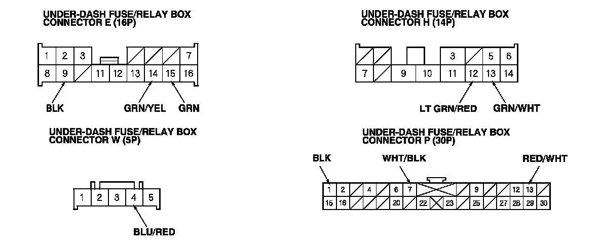 6. Reconnect the connectors to the under-dash fuse/relay box. Turn the ignition switch to ON (II), and do these input tests at the following connectors on the under-dash fuse/relay box.
