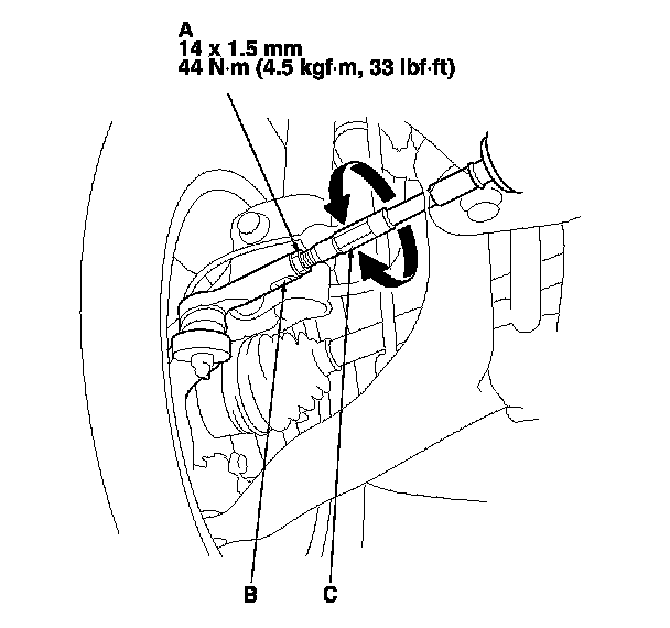 3. Loosen the tie-rod locknuts (A) while holding the flat surface sections (B) of the tie-rod end with a wrench, and turn both tie-rods (C) until the front toe is within specifications.
