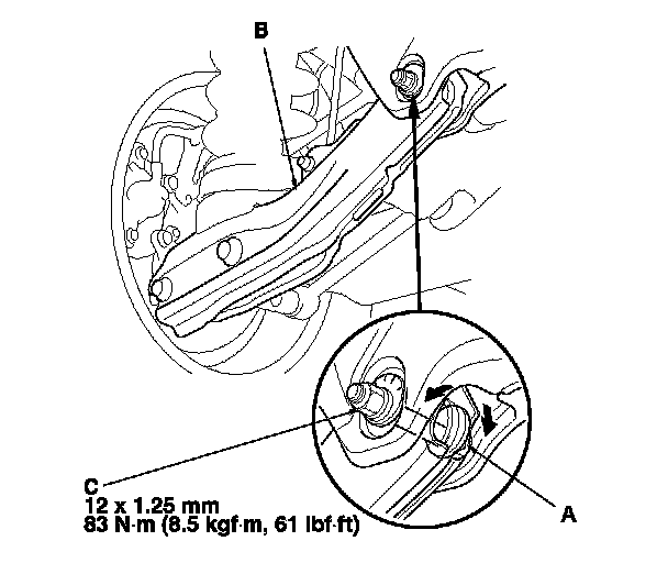 3. Hold the adjusting bolt (A) on the lower arm B, and remove the self-locking nut (C).