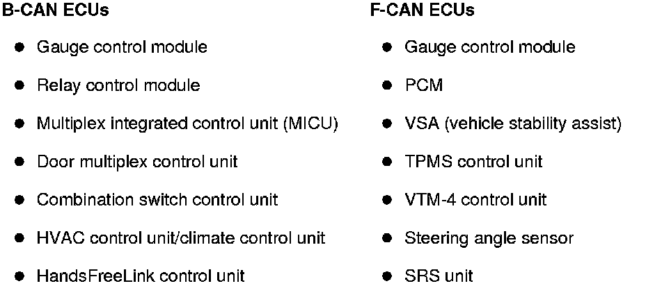 Several ECUs are connected to each of the two networks. The gauge control module is part of both networks since it is the "gateway" between them. Here is a list of ECUs and the network they are connected to.