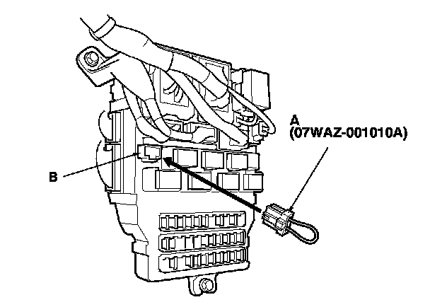 4. Connect the MPCS service connector (A) to the MICU service check connector socket (B) in the under-dash fuse/relay box.