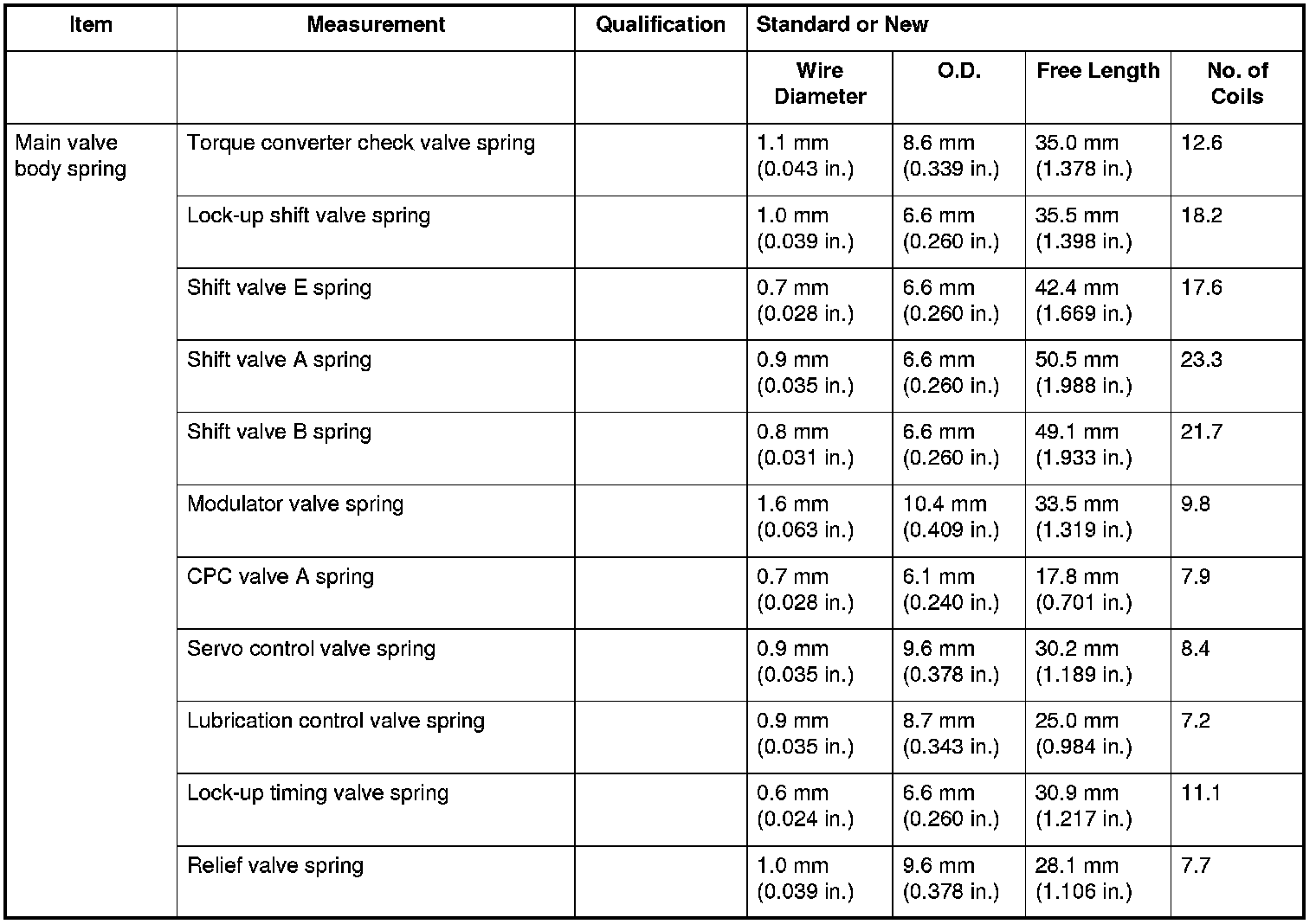 Main Valve Body Spring Specifications