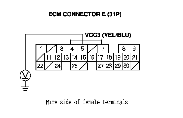 90. Measure the voltage between body ground and ECM connector terminal E5.