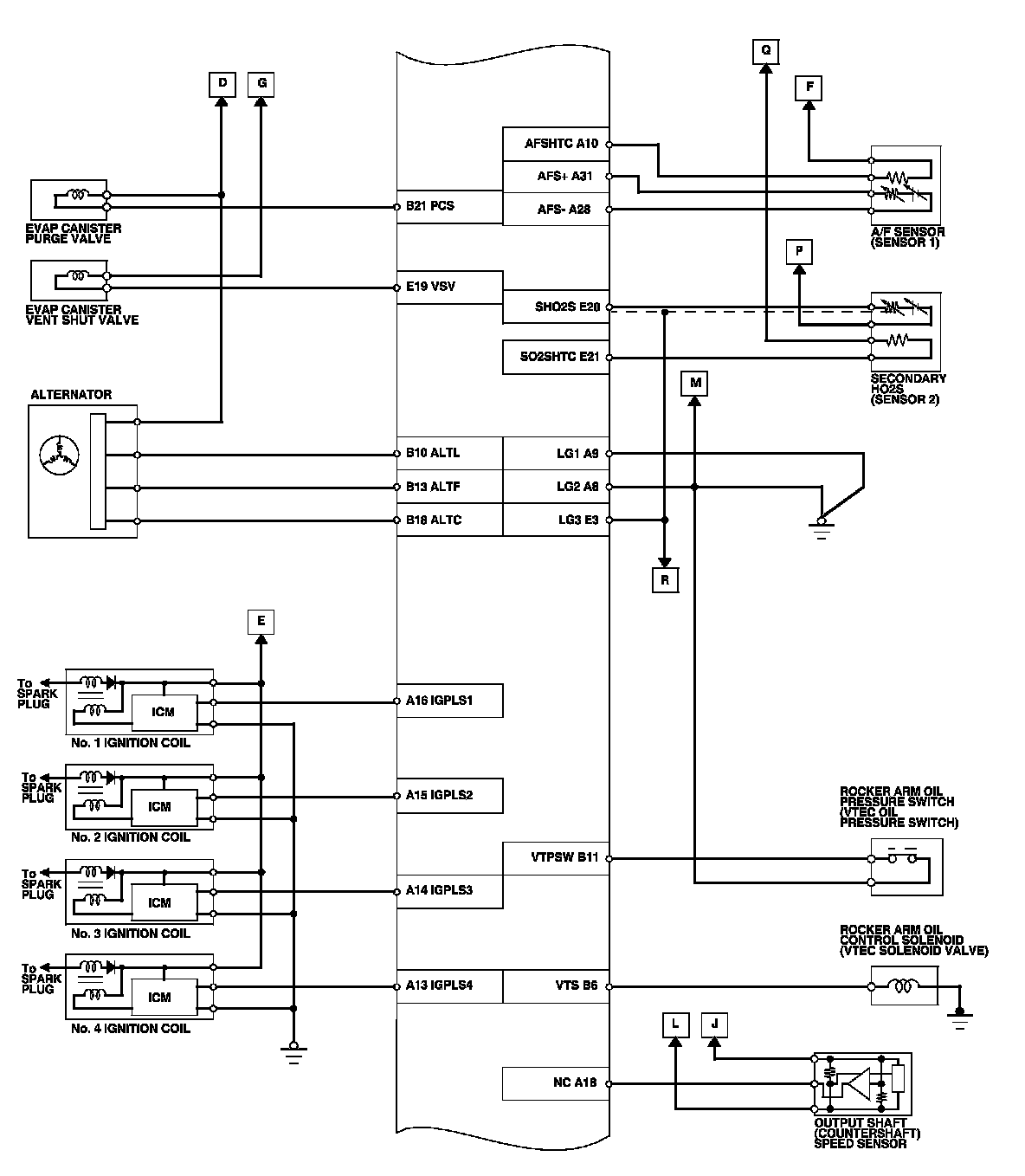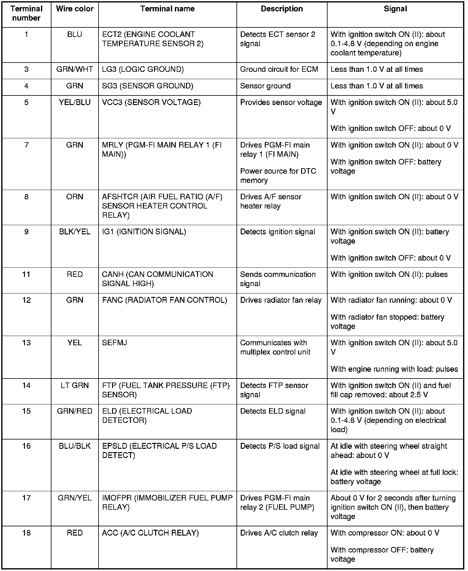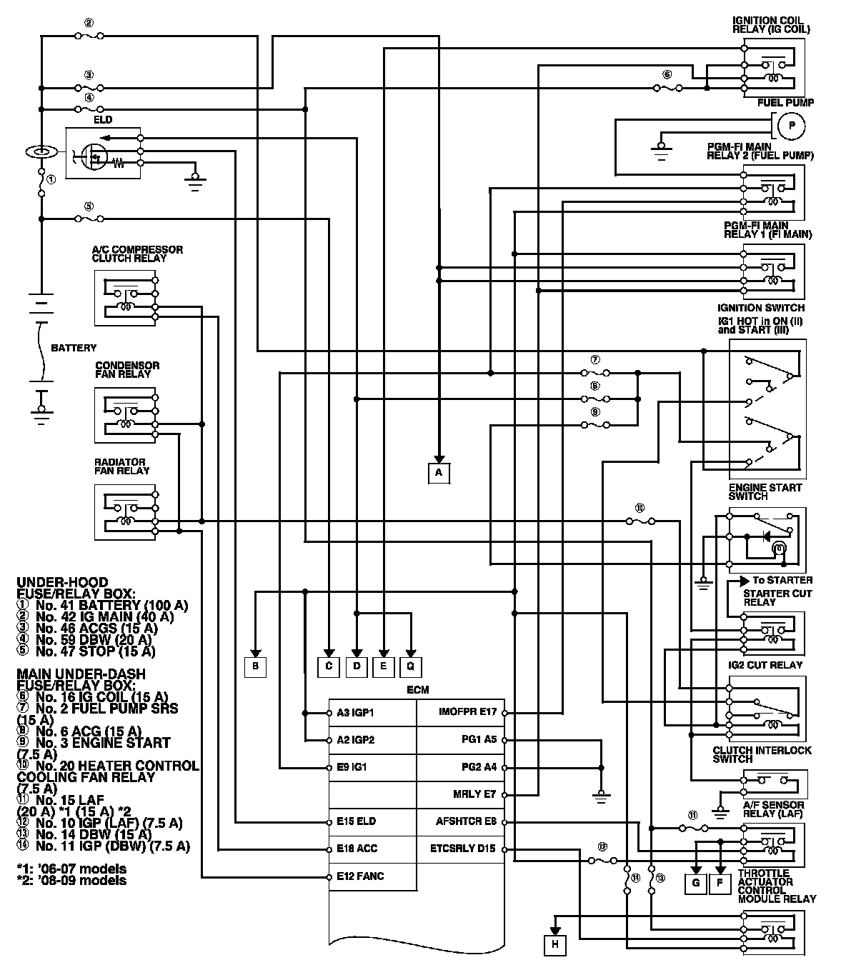 PGM-FI main relay 1 (FI MAIN) is energized whenever the ignition switch is turned to ON (II), to supply battery voltage to the ECM, power to the injectors, and power for PGM-FI main relay 2 (FUEL PUMP). PGM-FI main relay 2 (FUEL PUMP) is energized to supply power to the fuel pump for 2 seconds when the ignition switch is turned to ON (II), and when the engine is cranking or running.