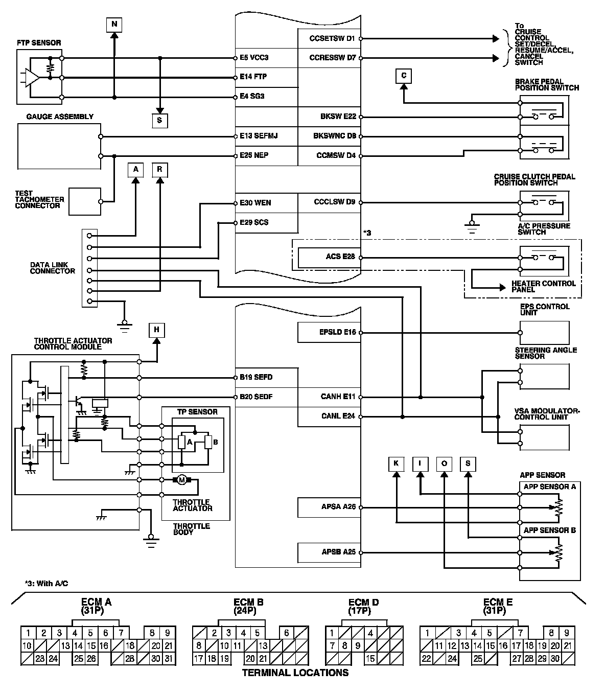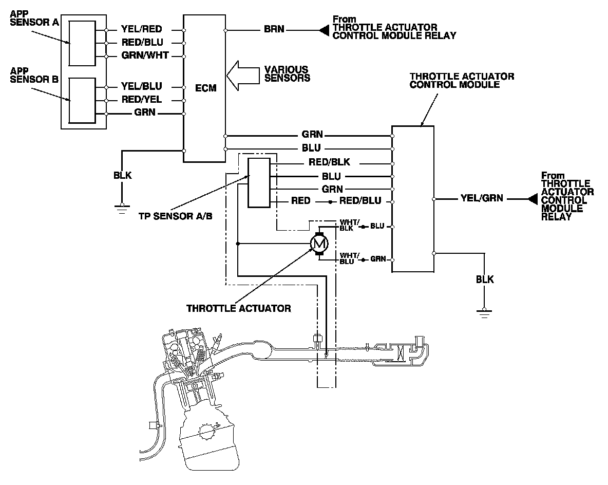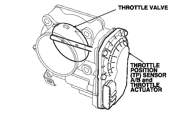 The electronic throttle control system consists of the throttle actuator, throttle position (TP) sensor A/B, accelerator pedal position (APP) sensor A/B, the throttle actuator control module, and the ECM.